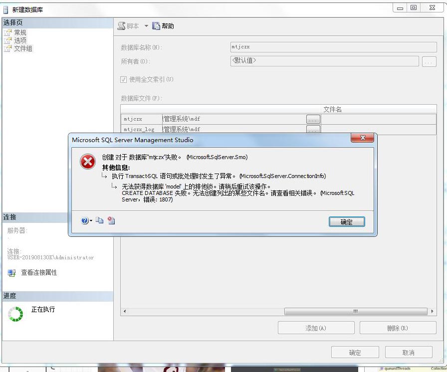 創(chuàng)建數(shù)據(jù)庫(kù)失敗,提示無(wú)法獲得數(shù)據(jù)庫(kù)‘model’上的排他鎖,如下圖所示: