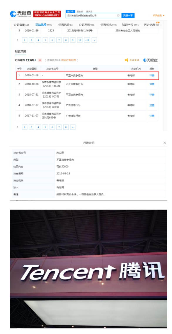 3月20日下午消息,天眼查數據顯示,3月18日,深圳市騰訊計算機系統有限公司新增一條行政處罰,類型為不正當競爭行為,處罰內容為罰款5萬。