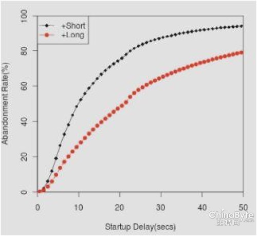 上述麻省大學的研究考察了670萬獨立用戶的2300萬次視頻觀看活動,數據來自CDN服務Akamai。隨著互聯網網速的變快,用戶的耐心程度正不斷下降。視頻加載時間每長1秒,就會有約6%的人放棄觀看。如果視頻加載時間達到5秒,那么將有約20%的用戶放棄觀看。不過對于時長較長的視頻,用戶的耐心也更長。